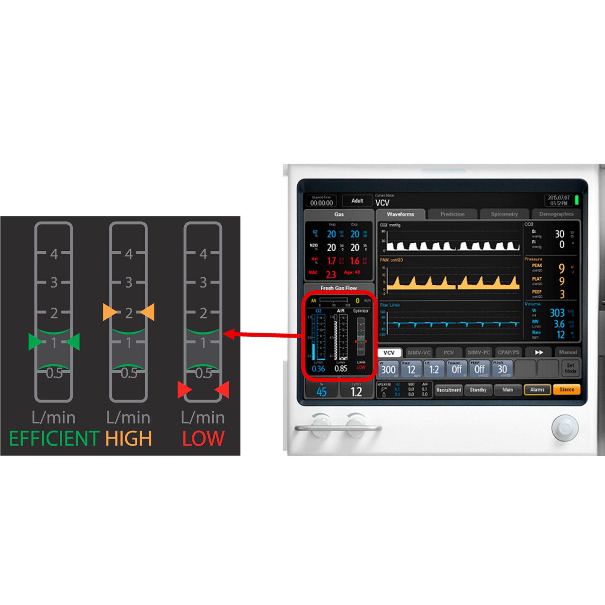 - Функция оптимизатора низкого потока предоставляет указания в реальном времени для контроля расхода потока свежего газа и анестетика, а также обеспечения безопасной низкопоточной анестезии.