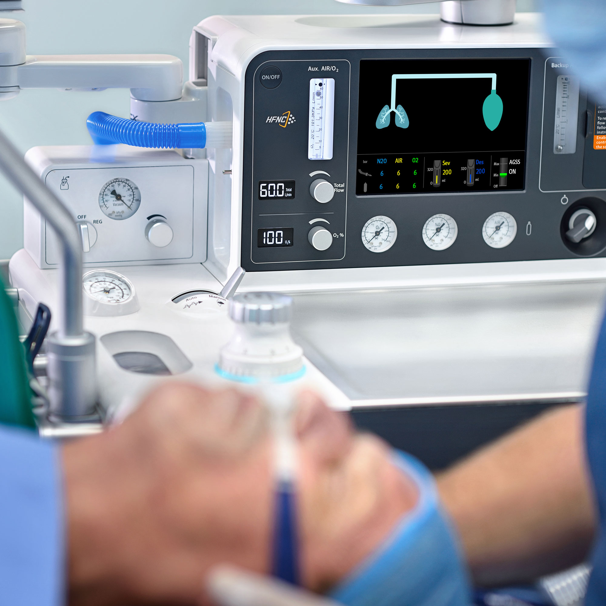 - Возможность проведения высокопоточной кислородотерапии через носовую канюлю (HFNC) позволяет обеспечить должный уровень оксигенации пациента, продлевая время безопасного апноэ до 30 минут.