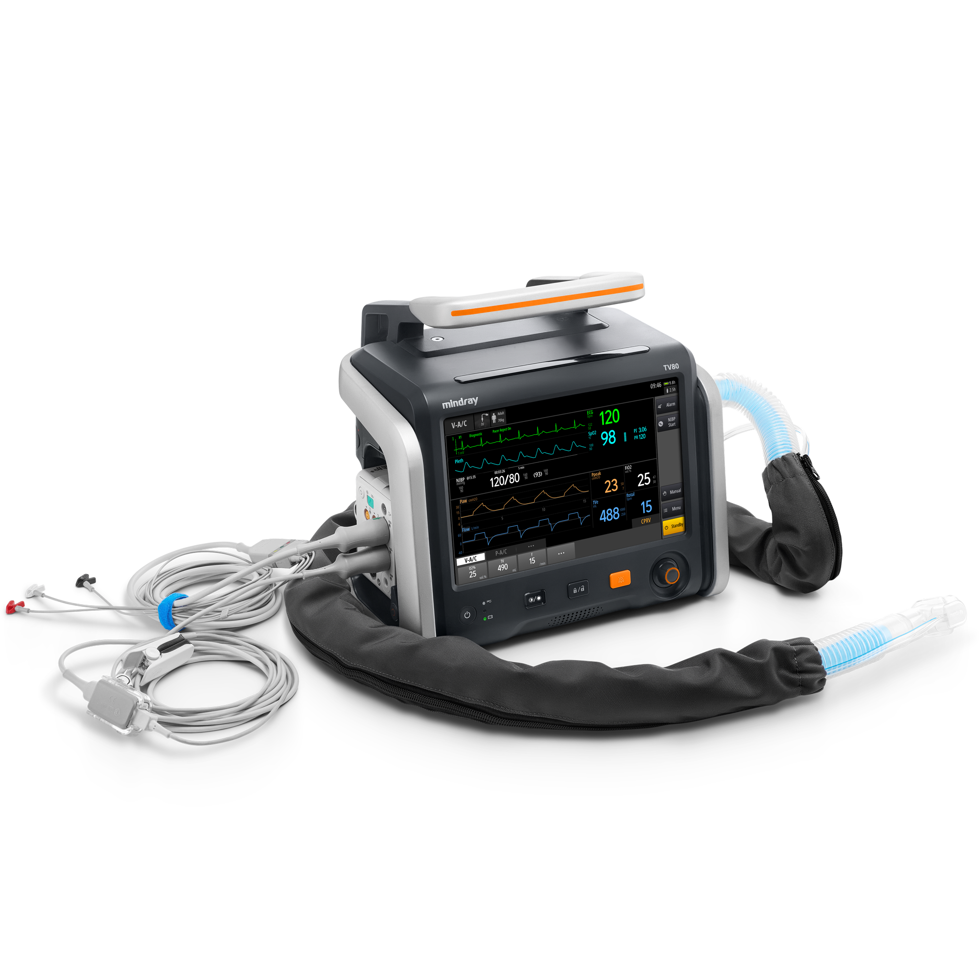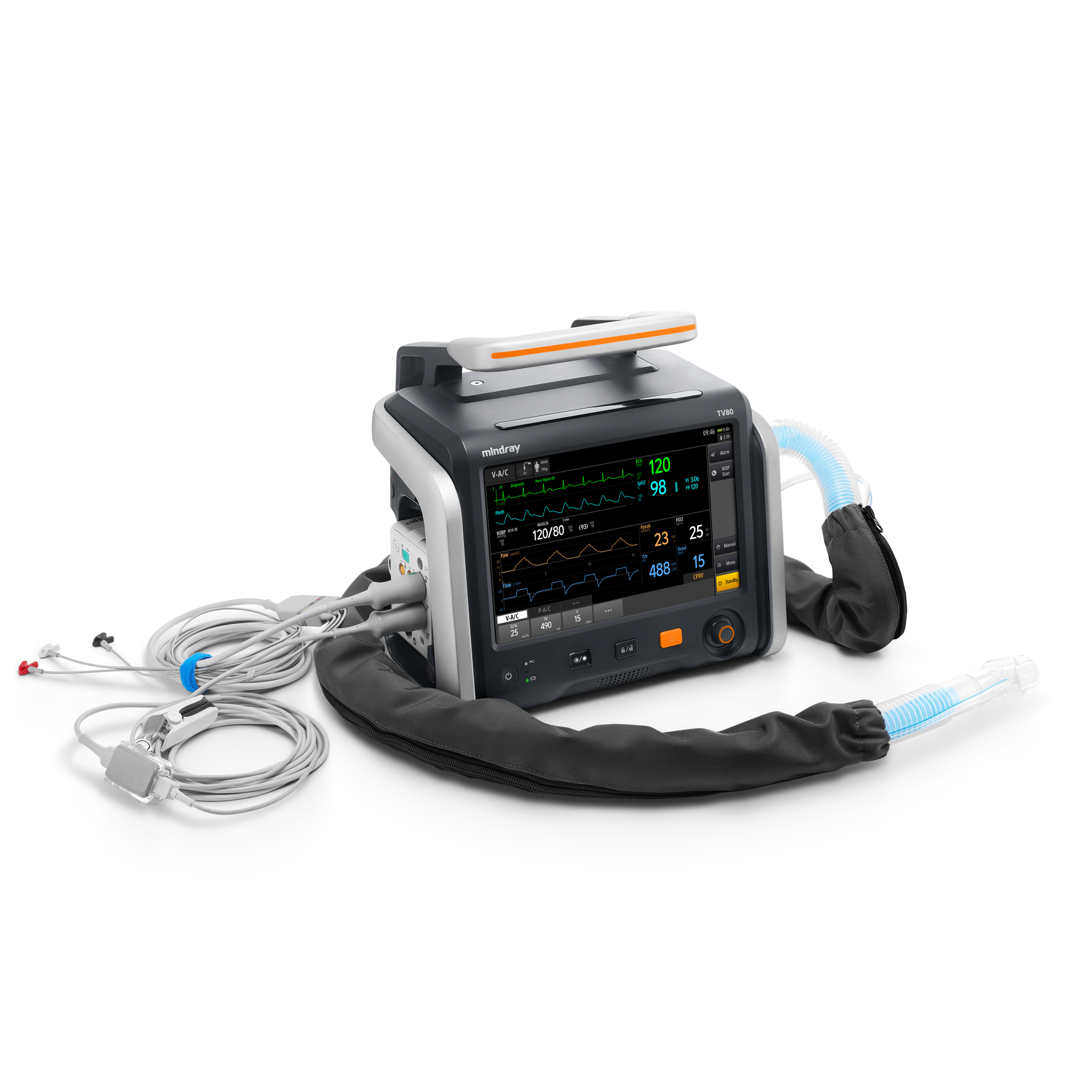 - Широкий выбор режимов ИВЛ, включая интеллектуальный режим вентиляции (AMV) и режим вентиляции при СЛР (CPRV), а также наличие неинвазивных режимов вентиляции и высокопоточной кислородотерапии, позволяют проводить эффективную респираторную поддержку при различных клинических сценариях.