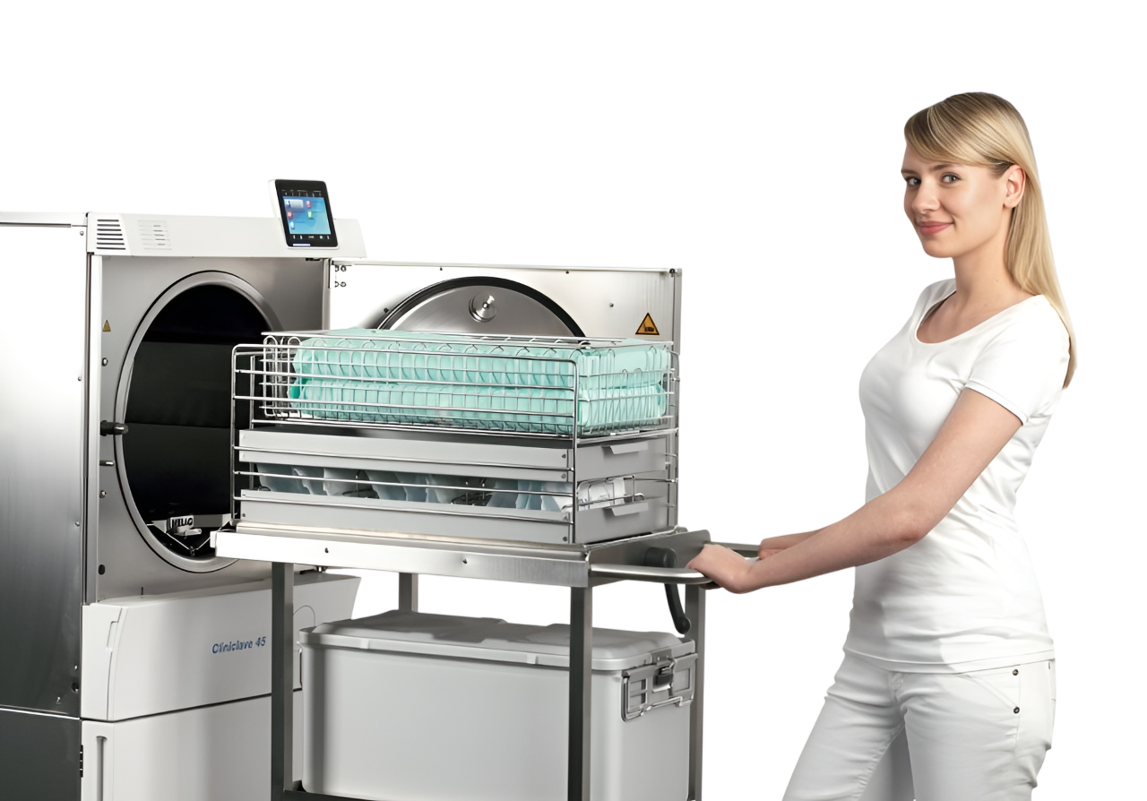 - Запатентованная технология двойной оболочки обеспечивает рекордно короткие сроки работы: стерилизация класса B в быстрой программе для упакованных инструментов занимает всего 27 минут, а универсальная программа для максимальной загрузки — около 48 минут.