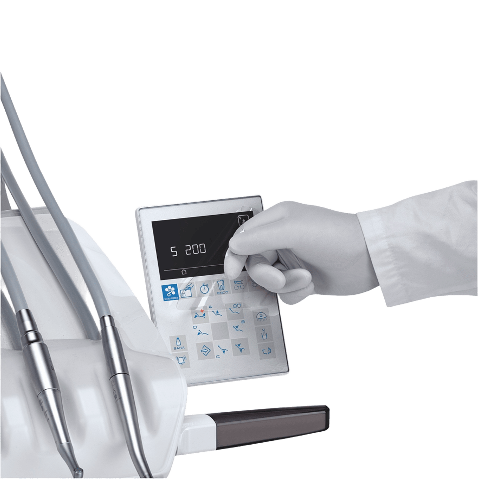 - Консоль врача оборудована сенсорным ЖК-дисплеем для определения скорости и мощности инструментов.