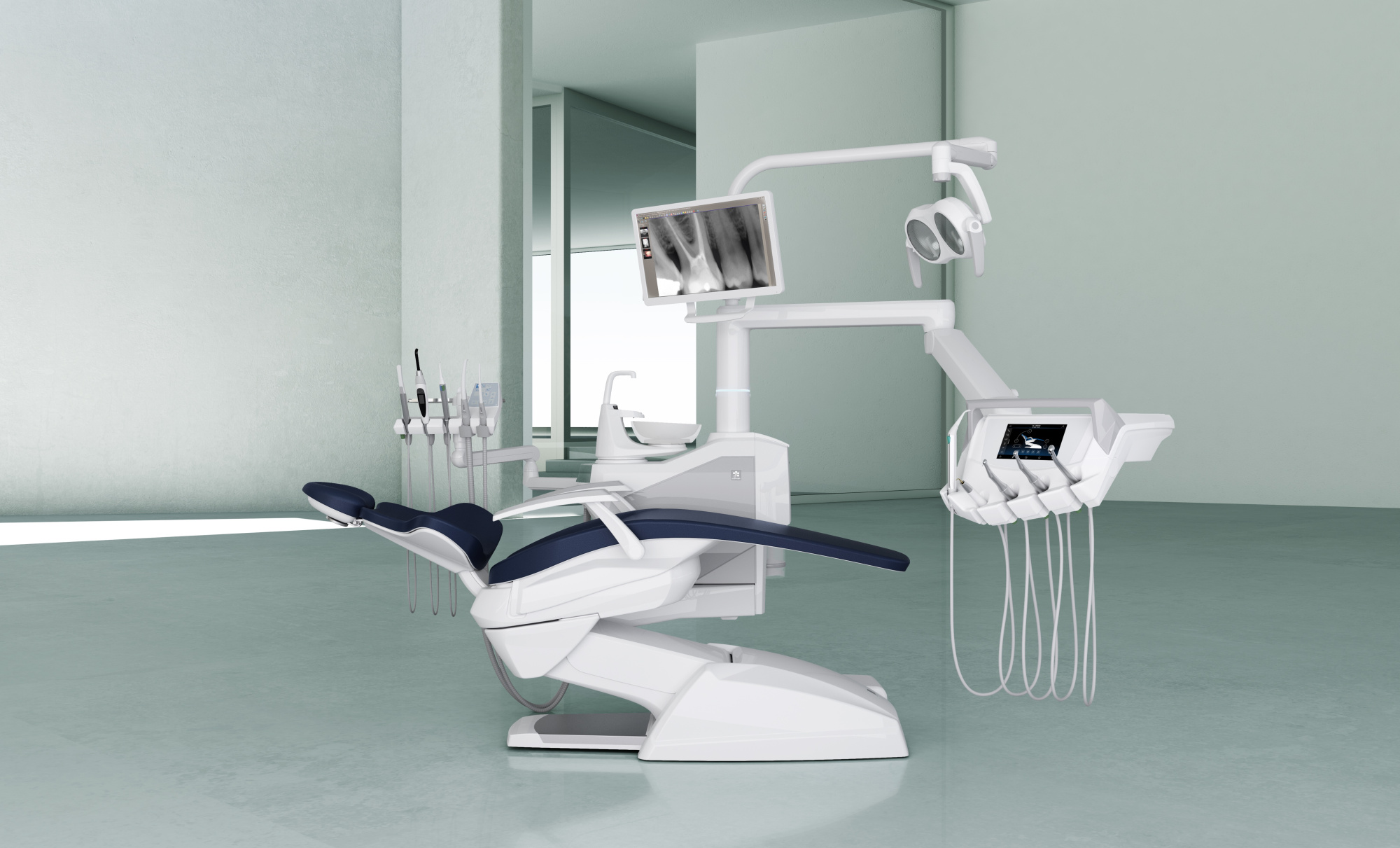 - Консоль врача оснащена FULL TOUCH MULTIMEDIA дисплеем высокого разрешения с возможностью подключения USB для удобства работы и отображения рентгеновских снимков, изображений и видео.
