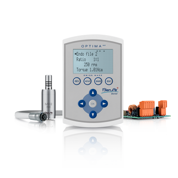 Комплект OPTIMA MX2int set DMX2 PRO 24Vac от швейцарского производителя Bien-Air представляет собой встраиваемую систему управления для стоматологических микромоторов, которая позволяет преобразовать пневматическую стоматологическую установку в электрическую. Он обеспечивает точный контроль над скоростью и крутящим моментом инструмента.