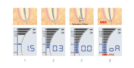 - Если кончик файла проходит мимо апекса, аппарат выдает быстрый и непрерывный звуковой сигнал, в то время как слово APEX отображается красным цветом и слово ОА (Over Apex) - синим.