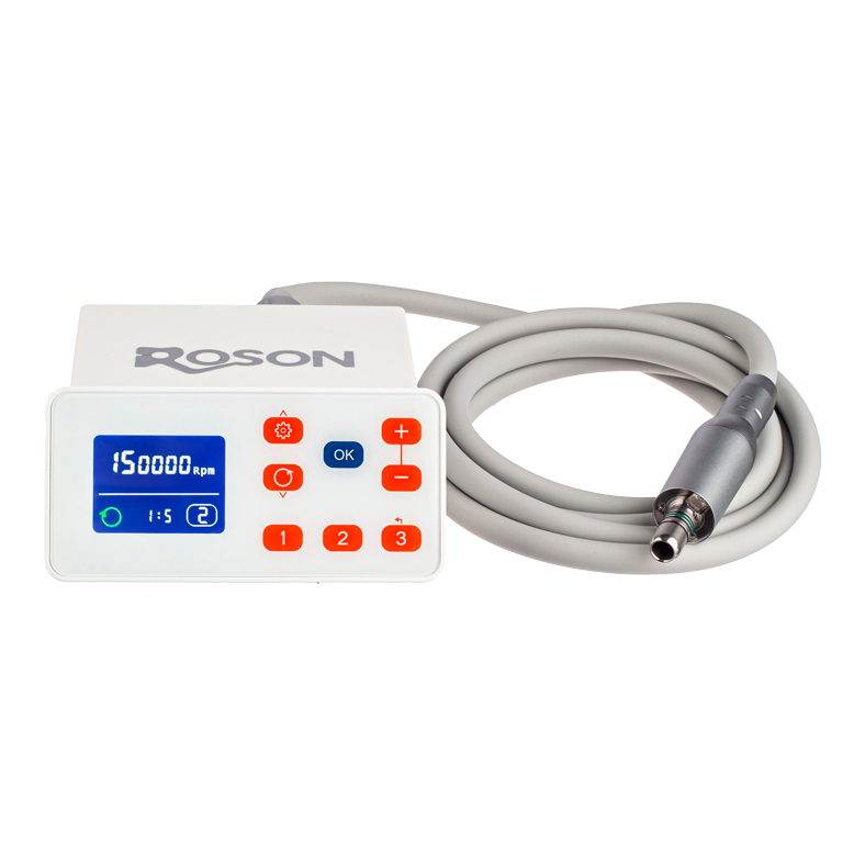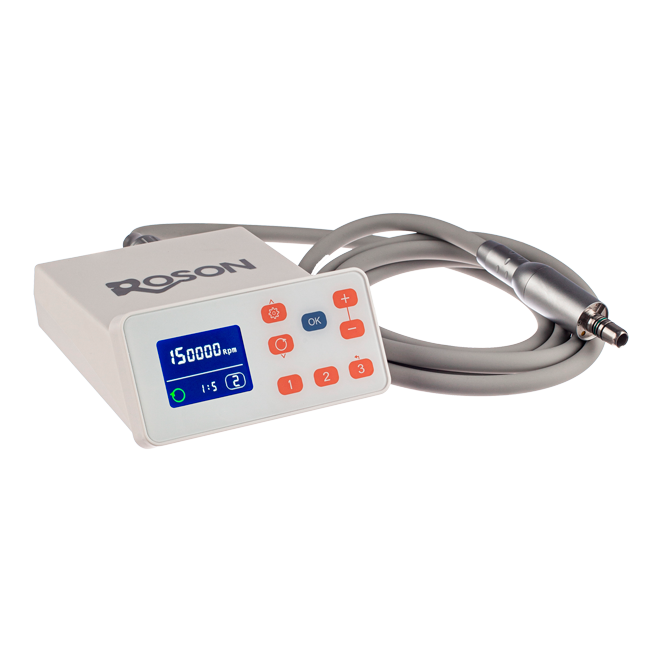 Микромотор оснащен внутренней системой подачи воды и воздуха на стоматологический наконечник для организации охлаждения боров спреем.