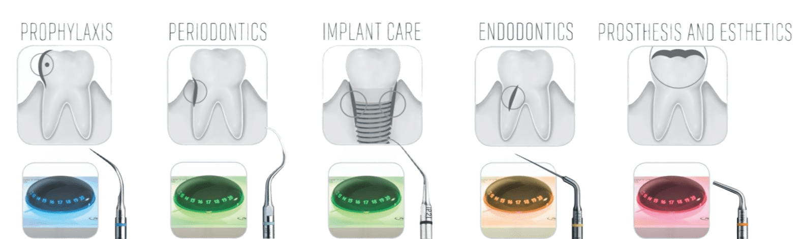 - Более 80 различных насадок, отвечающих всем клиническим потребностям: профилактика, пародонтология, уход за имплантатами, эндодонтия, хирургическая эндодонтия, консервативное лечение, ортопедическая стоматология.