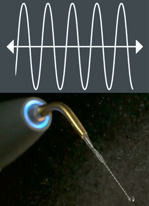 - Мощная кавитация на кончике насадки вызывает фрагментирование зубных отложений и дезинфицирующий эффект.