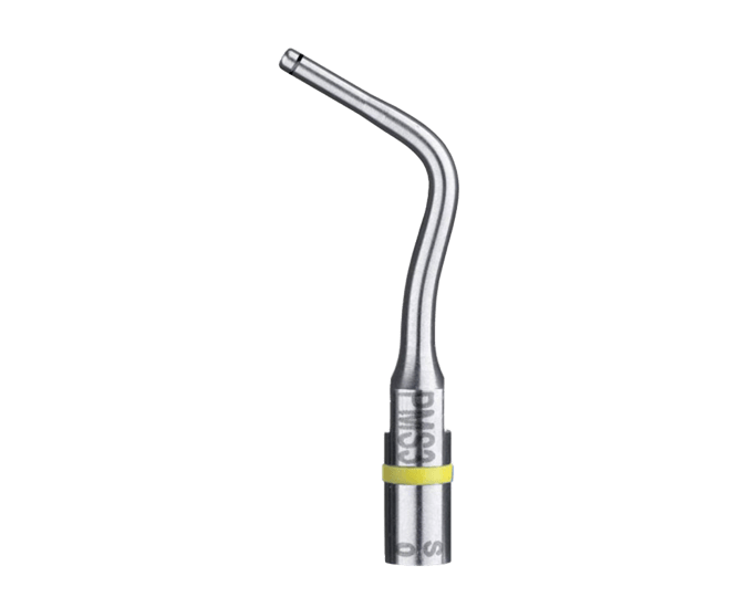- Далее используется насадка c алмазной крошкой PM1 (выпукло-закругленная) или насадка PMS 1 с закругленным внутренним углом для смещения линии обработки в апикальном направлении. Ультразвуковыми насадками заглаживаются бороздки от алмазных боров и уступ погружается под десну.
