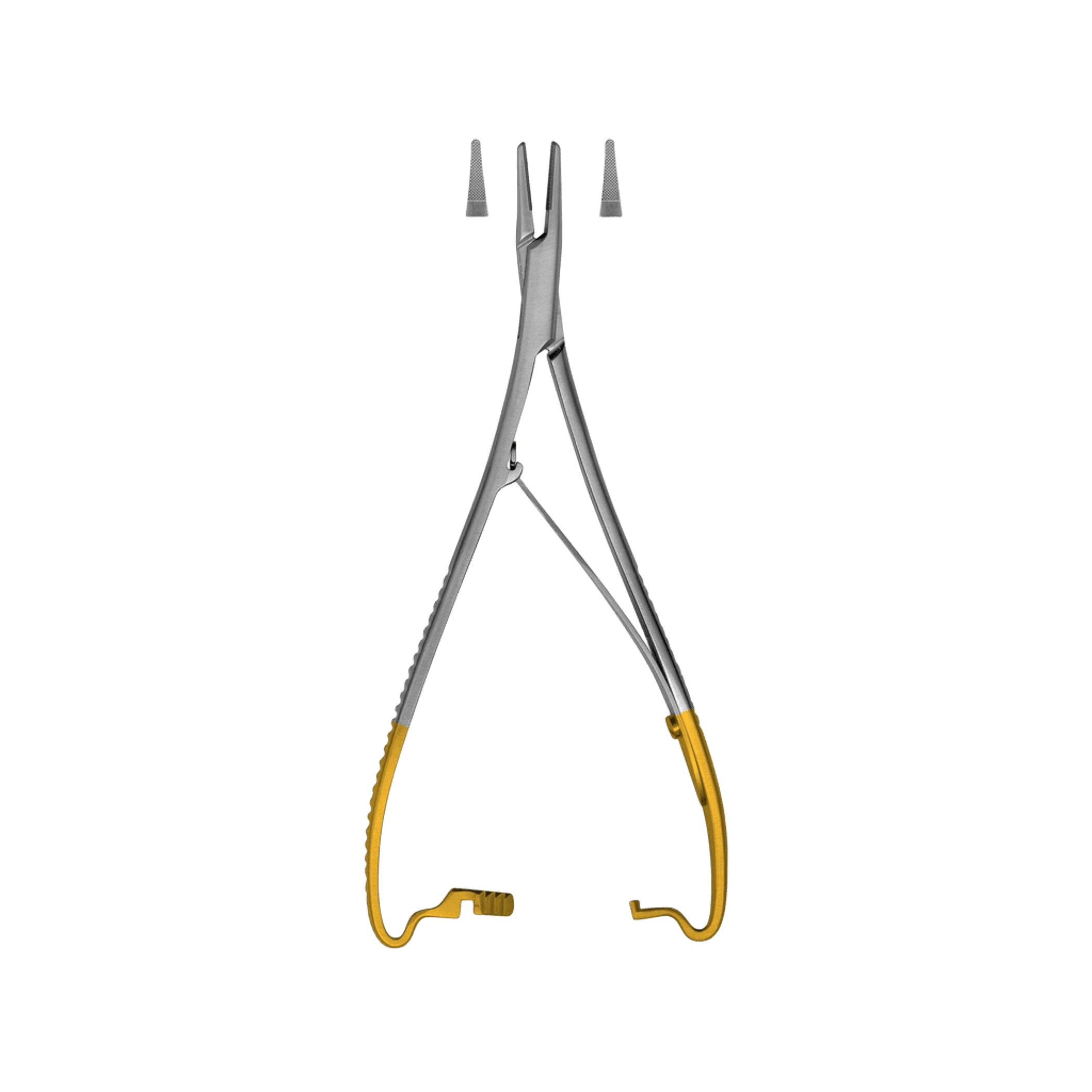 Общехирургические иглодержатели широко используются в стоматологии для работы с толстыми нитями. Они состоят из рабочих частей, браншей, замка и колец для пальцев.