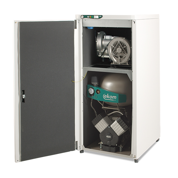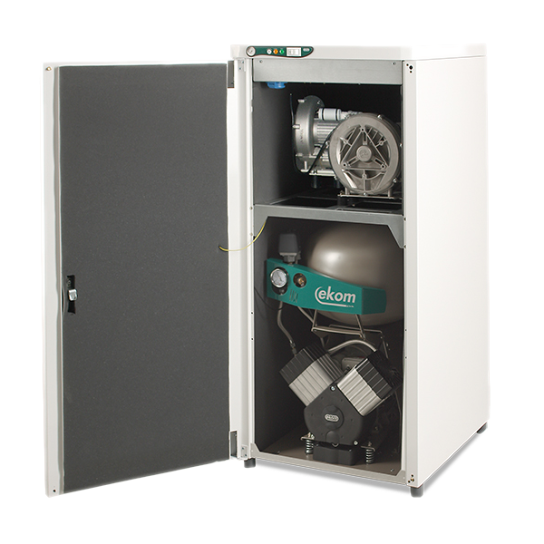 Безмаслянный компрессор EKOM с двумя отсасывающими агрегатми серии DUO 2 являются источниками чистого сжатого воздуха, несодержащего масляных капельных включений, который предназначен для приведения в действие зубоврачебных приборов и устройств, а также для создания пониженного давления в отсасывающем агрегате. Благодаря своим параметрам и размерам резервуара воздуха объемом 25 л и наличию отсасывающего агрегата, компрессор этого типа может обслуживать два комплекса стоматологических устройств, которые оборудованы вытяжным блоком. Сжатый воздух, производимый безмасляным компрессором указанного типа, обеспечивает высокую степень соблюдения гигиены и качества труда стоматолога, не создавая, притом, вокруг себя среду, содержащую чужеродные вещества. По своему дизайну компрессор этого типа являются очень удобным для применения непосредственно в зубоврачебном кабинете, органично вписываясь в их интерьер.