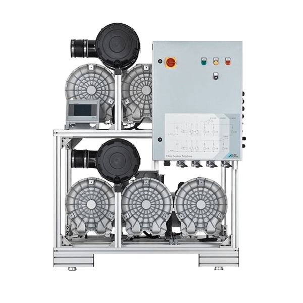 Dental предлагает вакуумные установки для сухих и полусухих аспирационных систем. Они представлены в 6 вариантах и пригодны для более 100 стоматологических установок. Интегрированный бактериальный фильтр отработанного воздуха следует заменять только после 3500 часов работы. Мощные воздуходувки настраиваются программируемым контроллером в соответствии с Вашими потребностями.