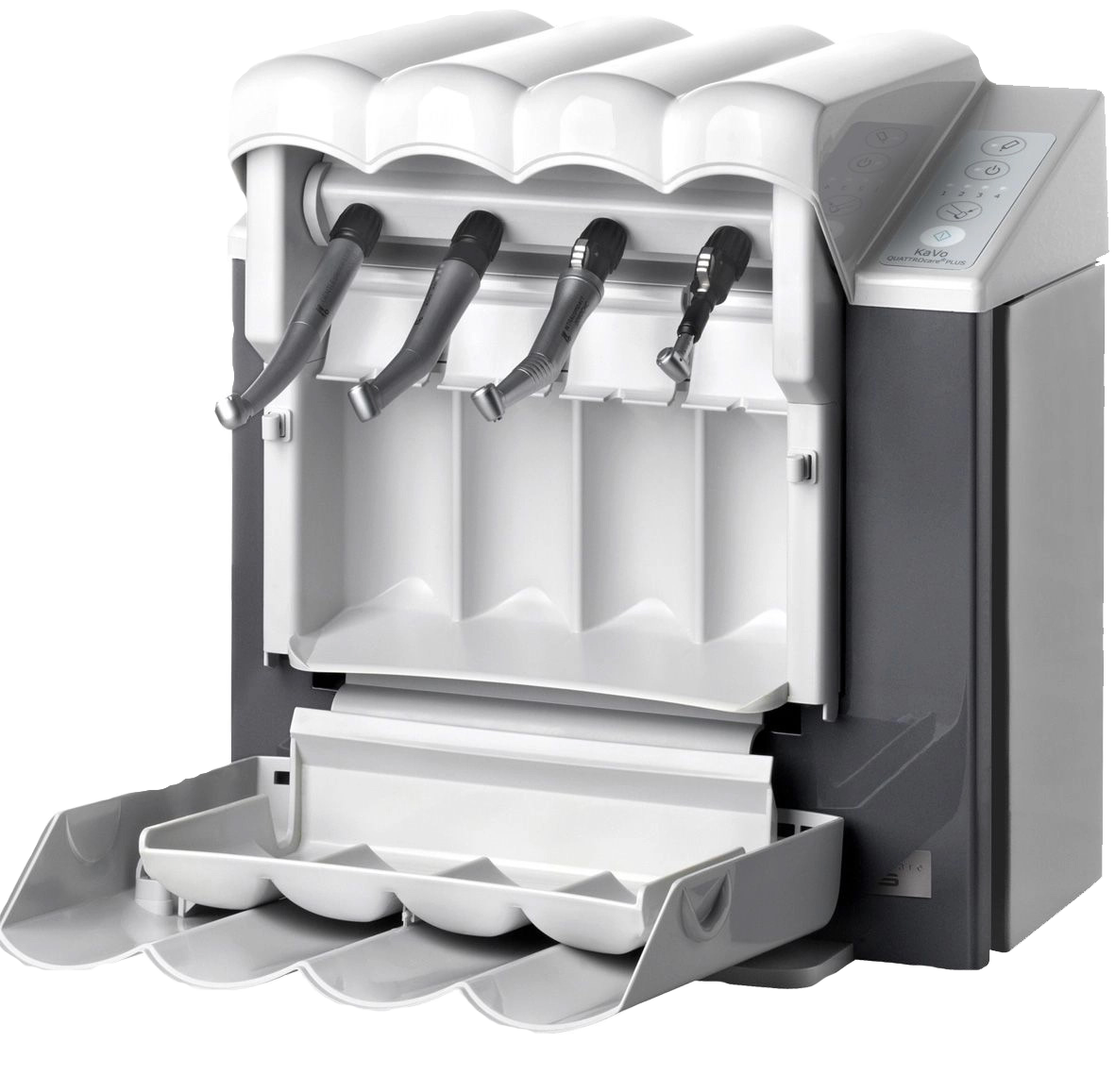 KaVo QUATTROcare® Plus 2124A - программно-управляемый прибор для чистки и смазки турбинных, угловых наконечников, а также головок к наконечникам. Прибор дополнительно подключается к источнику сжатого воздуха для дополнительной продувки спрей каналов и удаления излишков масла.
