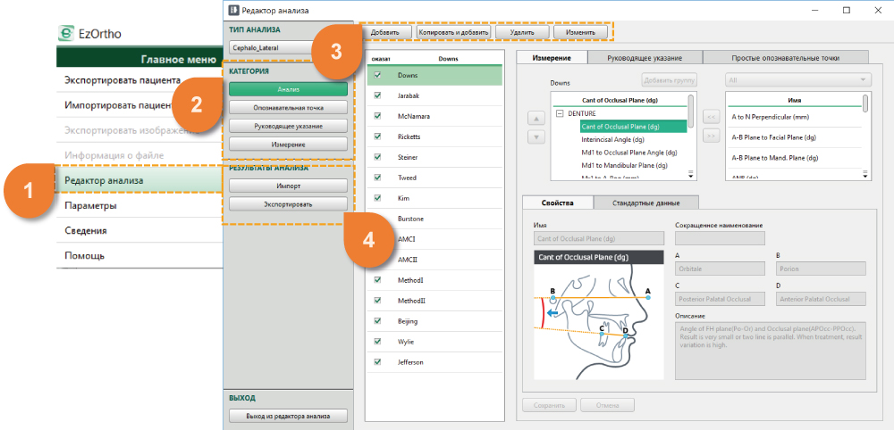EzOrtho Пользовательские методы анализаВ дополнение к встроенным методам анализа пользователи могут редактировать или создавать новые методы с помощью редактора анализа. Отредактированные анализы могут быть экспортированы и использованы/переданы участникам во время семинаров или в учебных заведениях.