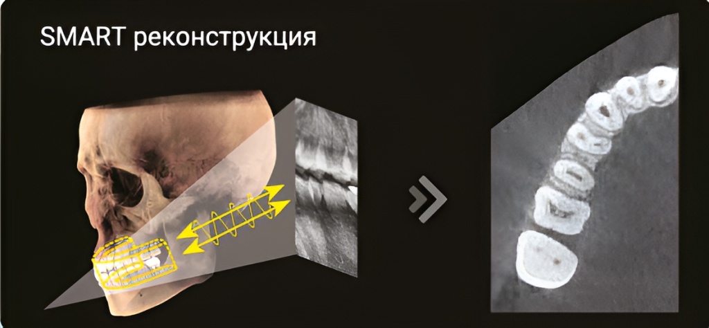 Инновационное поле обзора компьютерном томографе Green Smart обеспечивает захват объема в форме зубной дуги, что обеспечивает попадание более широкой зоны интереса по сравнению с другими аппаратами с аналогичными по размеру полями обзора. Обычно, поле обзора 10x8,5 достаточно для визуализации 8-х зубов. В случае ретенированных 3-х моляров высока вероятность того, что корни зуба могут быть срезаны. "Арочный объем" исключает такую вероятность, демонстрируя скрытую область зубного ряда.