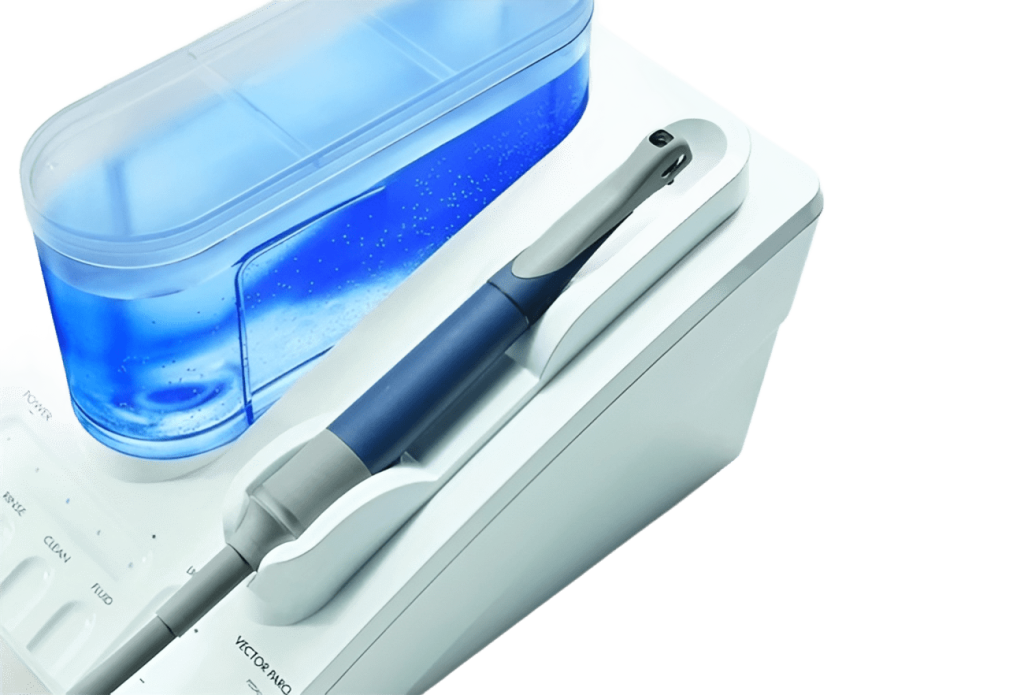 Данная система не имеет себе равных и постоянно совершенствуется фирмой Dürr Dental: принцип Vector – это клинически доказанная атравматичная и щадящая пародонтальная терапия. При этом ультразвуковая энергия целенаправлено изменяется в линейное направление. Благодаря запатентованному резонансному кольцу имеется возможность использовать ультразвуковую энергию параллельно поверхности корня. Таким образом, благодаря ультразвуковой энергии, имеется возможность эффективно и атравматично проводить лечение.